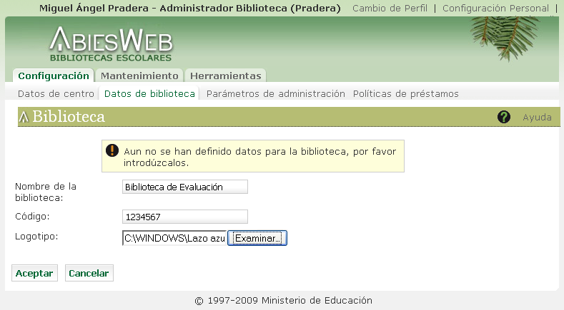 Nombre. Identificación de la biblioteca. No es obligatorio que coincida con el nombre del Centro.